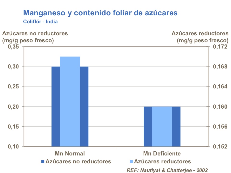 Mal suministro de manganeso también influye en la calidad de las brassicas. Cultivos que disponen de buen suministro de manganeso tienen niveles de azúcares más altos.