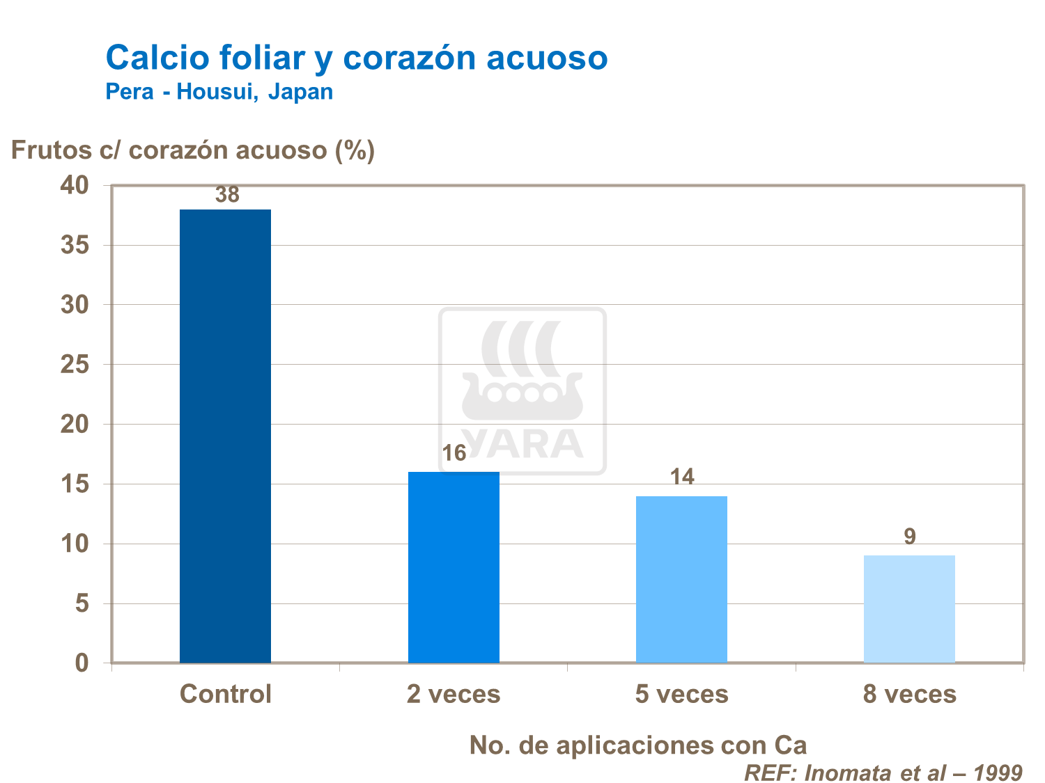 El calcio es crítico en perales, y la concentración en el fruto tiene que estar al doble de lo aceptado para manzanos. Es importante aplicar con regularidad. Hasta ocho aplicaciones foliares han demostrado ser eficaces en reducir el corazón acuoso en la pera japonesa.