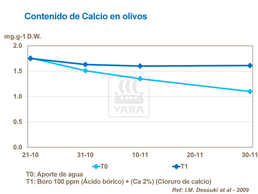 Para el mismo tratamiento como se describe más arriba, las concentraciones de Calcio y Magnesio en aceitunas fueron mantenidas durante la maduración del fruto y no se observó en las aceitunas ningún síntoma que pudiera afectar a la calidad del aceite. Las concentraciones de Calcio fueron significativamente mayores después de la segunda aplicación mientras que las concentraciones de magnesio permanecieron constantes durante todo el periodo.