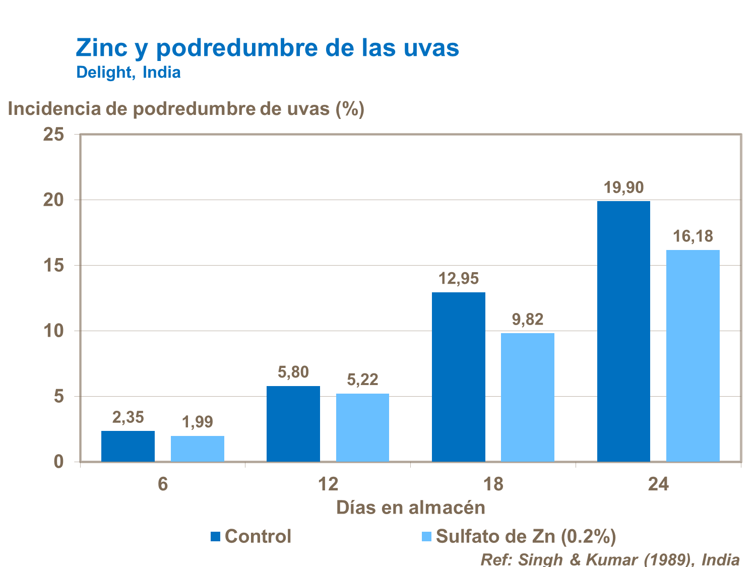 La deficiencia de zinc limita el desarrollo sano del cultivo. El Zinc tiene funciones esenciales en el proceso de multiplicación de las células. La aplicación de fertilizantes con zinc tienen un efecto positivo en el peso de la uva y la limitación de podredumbre en el almacén.