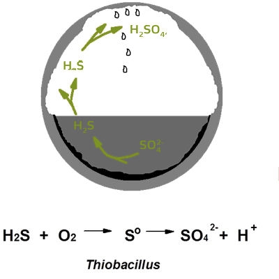 Una de las características del sulfuro de hidrógeno es que corroe las estructuras de los alcantarillados y las plantas de tratamiento de aguas residuales. Ataca al hormigón, al cobre, al acero y a la plata. En el ambiente caliente y húmedo de un alcantarillado, el sulfuro de hidrógeno se oxida en ácido sulfúrico por la acción de la bacteria Thiobacillus (Gram negativa) en las paredes de la tubería. Este ácido sulfúrico es corrosivo y ataca al agua residual y a las infraestructuras de tratamiento de aguas residuales. La corrosión afecta particularmente a las partes sumergidas de las estructuras en los desagües o las plantas de tratamiento de aguas residuales.